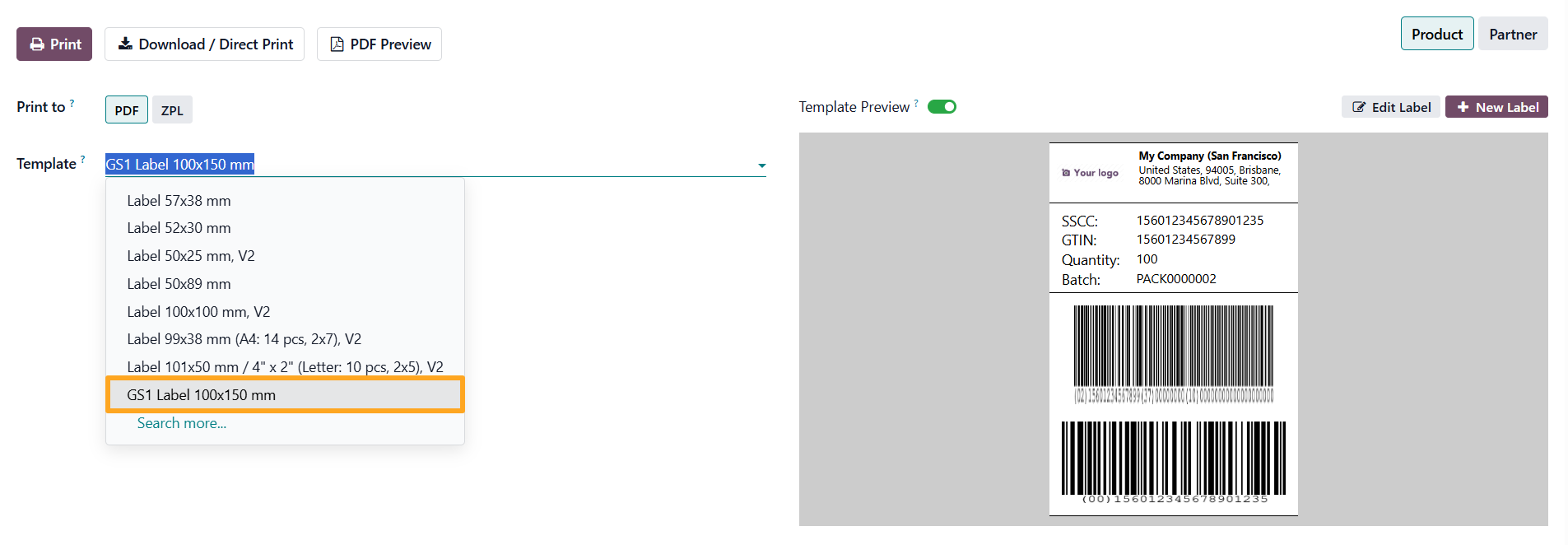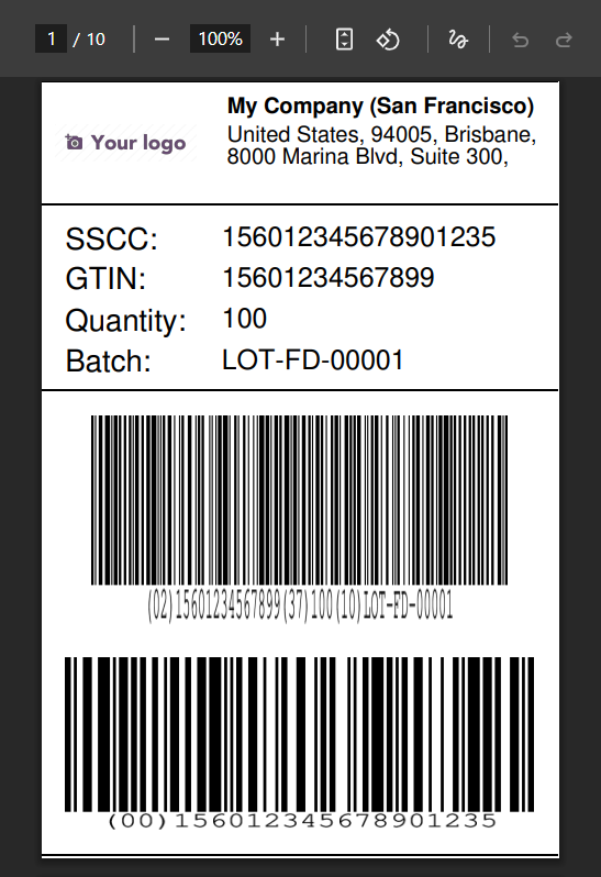 Example of a 100×150 mm label with GS1 barcodes in PDF format:
