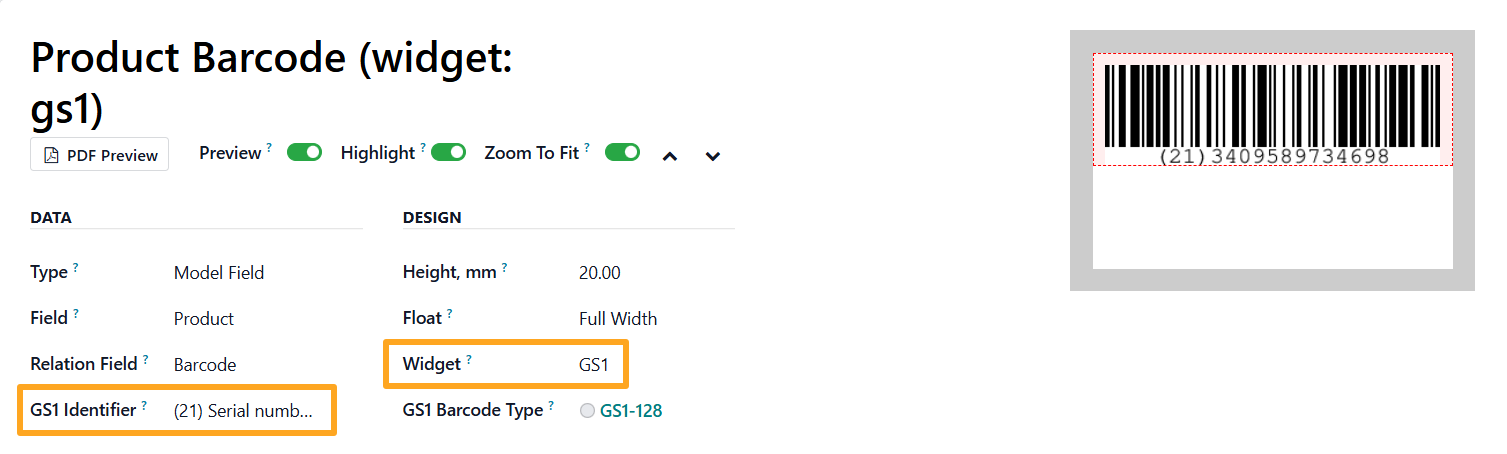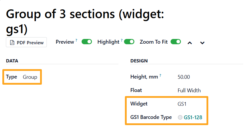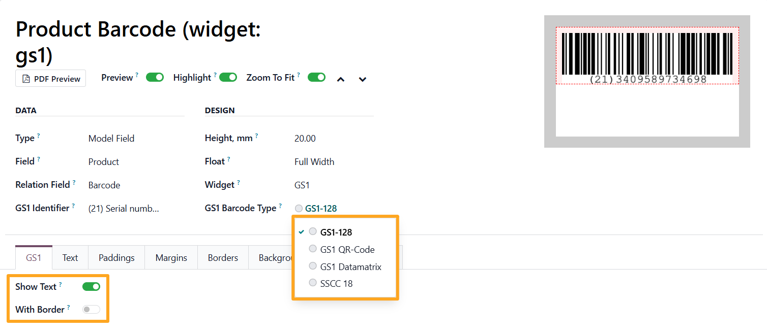 To manage the barcode appearance, select the GS1 Barcode Type in the Design section: