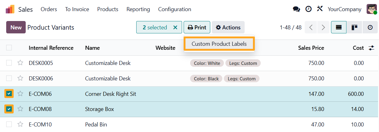 After installation, the module allows label printing from any product list. Select one or multiple products and choose Print - Custom Product Labels to open the print wizard: