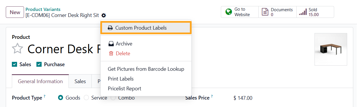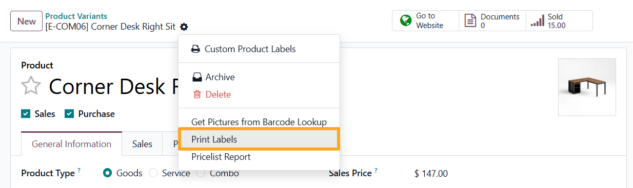 On the product page, label printing is available via the actions menu - Custom Product Labels: