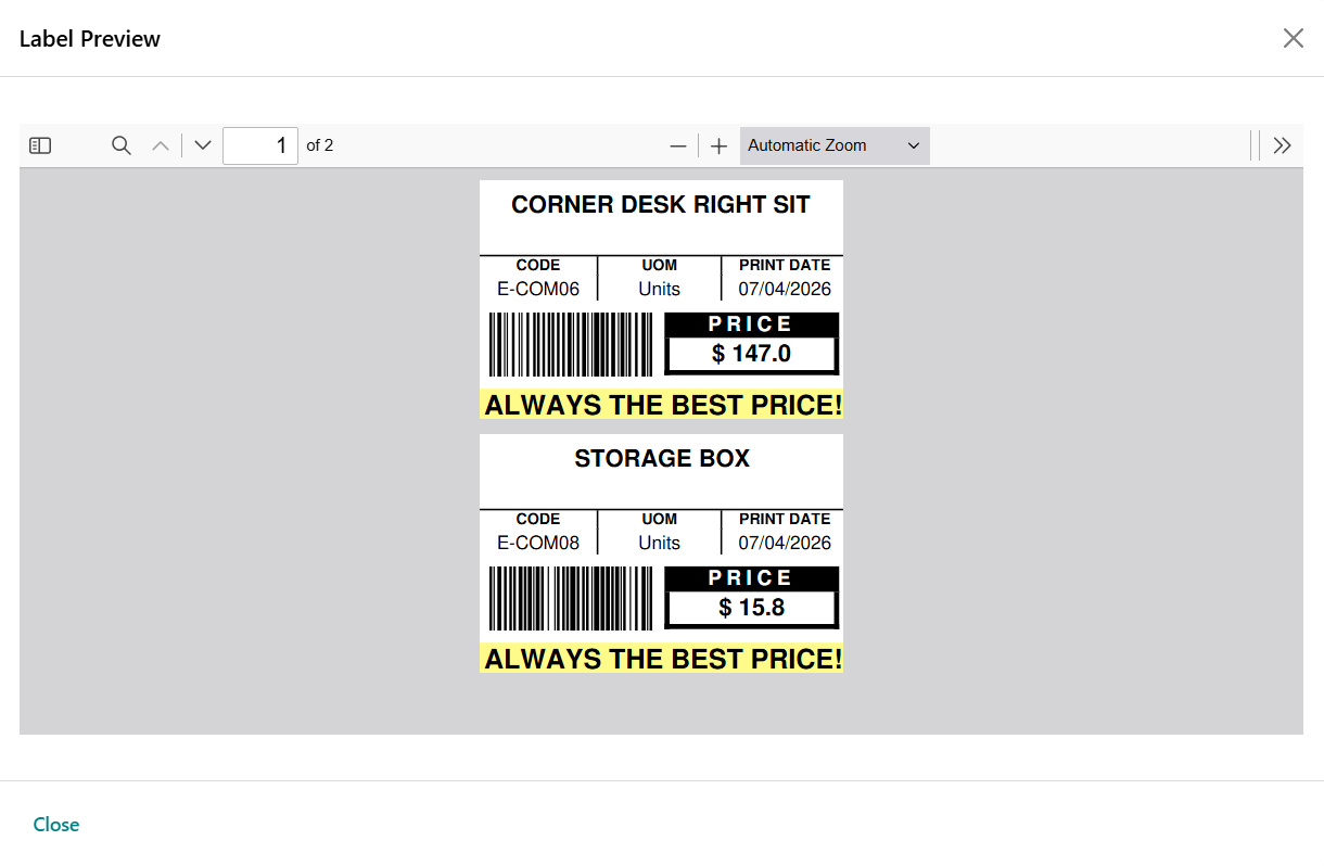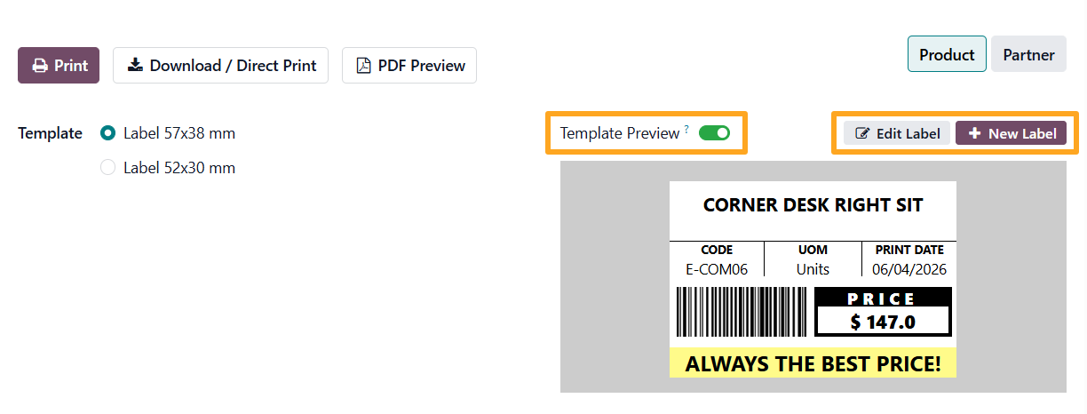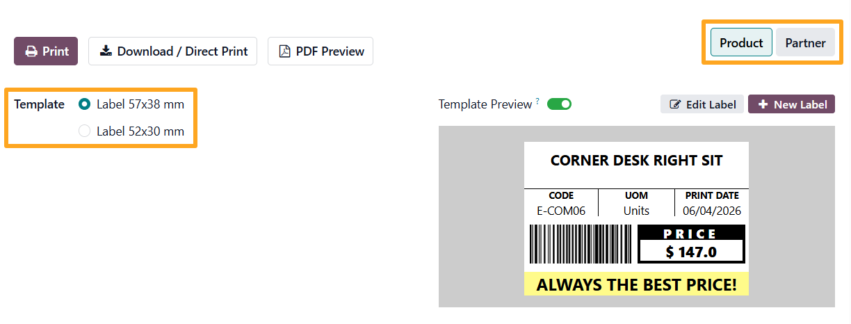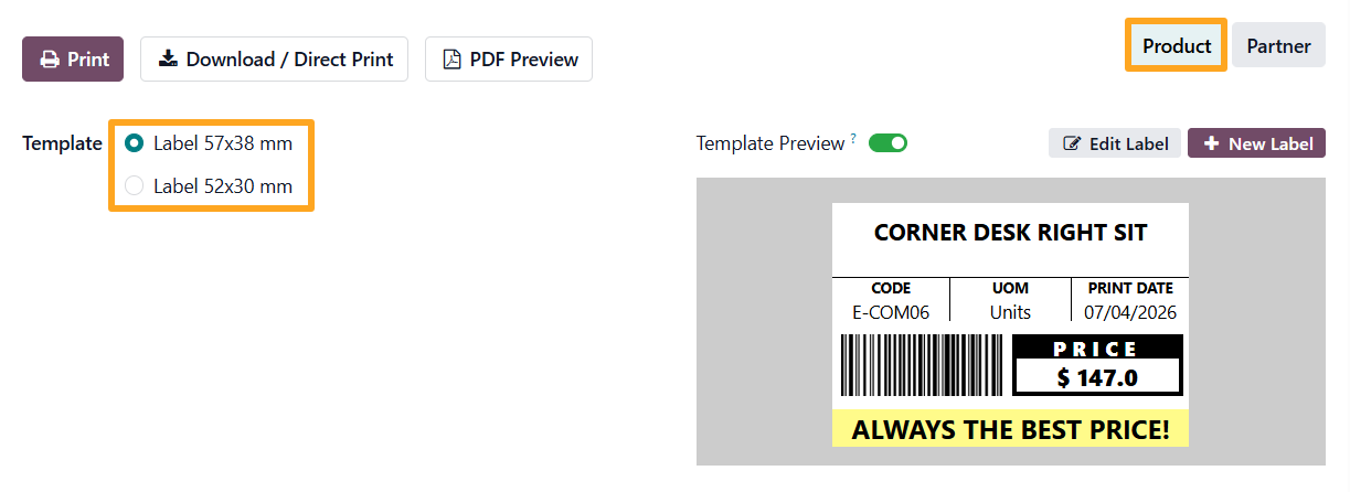 02Download / Direct Print: downloads a file or sends labels to direct printing via IoT Box or third-party solutions