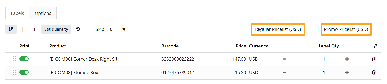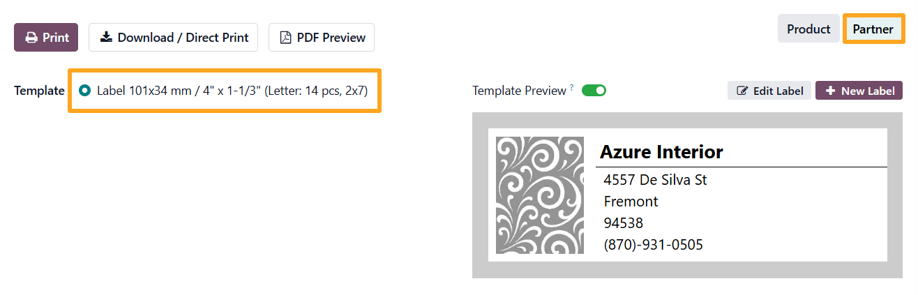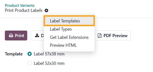 To use this module via the Print Labels button, replace the standard Odoo print wizard: