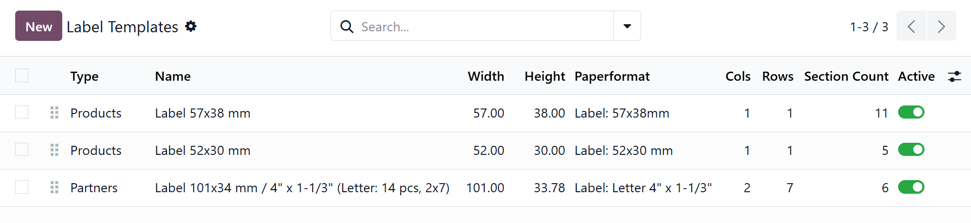 Odoo Product Label Builder Start allows creating new label templates from scratch and includes three predefined label templates available for editing.