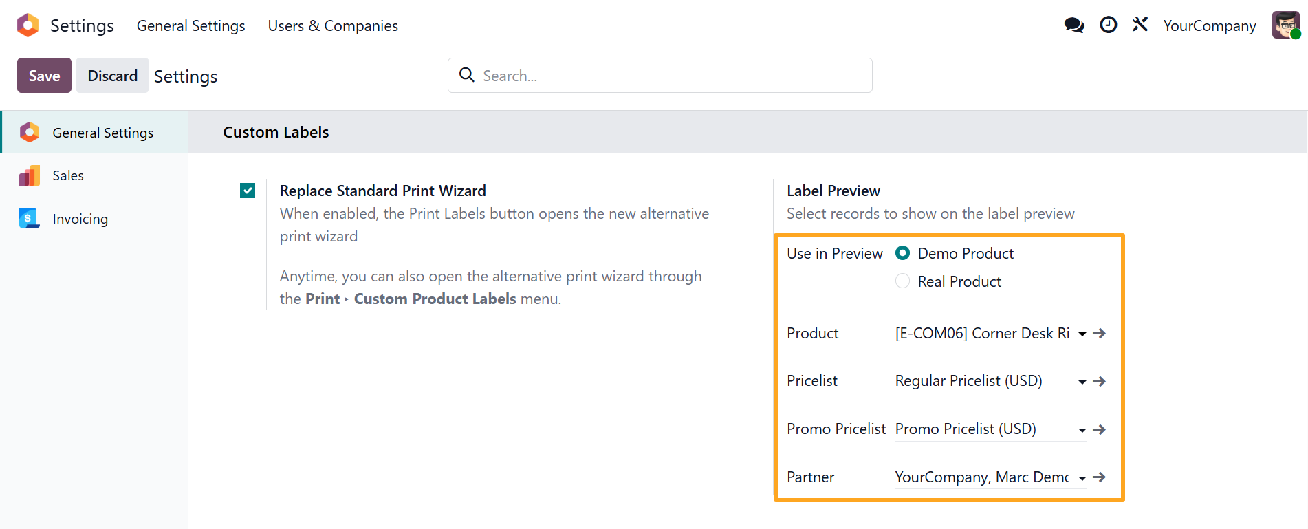 In General Settings, under the Custom Labels section, configure data used for label preview in the print wizard: