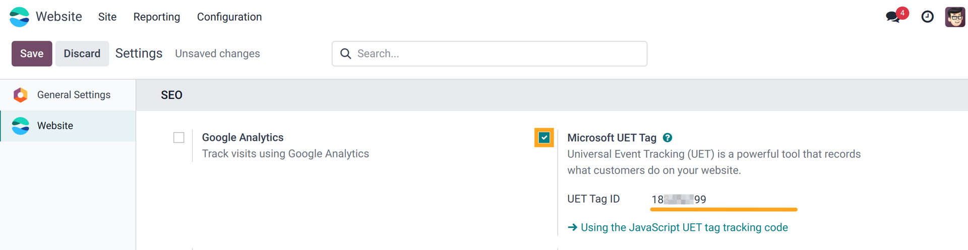 After the module installation, add your Microsoft Advertising UET tag ID. Set it in the Website - Configuration - Settings menu by activating the Microsoft UET Tag option and specifying your Tag ID: