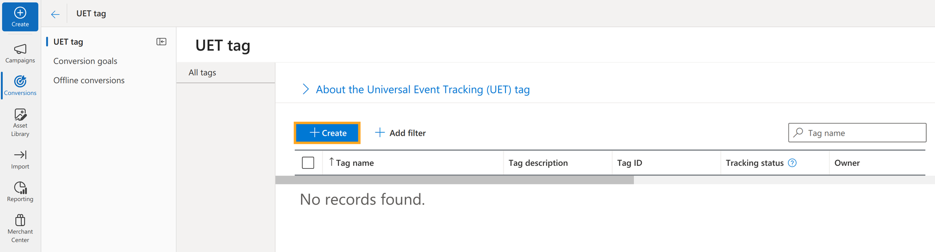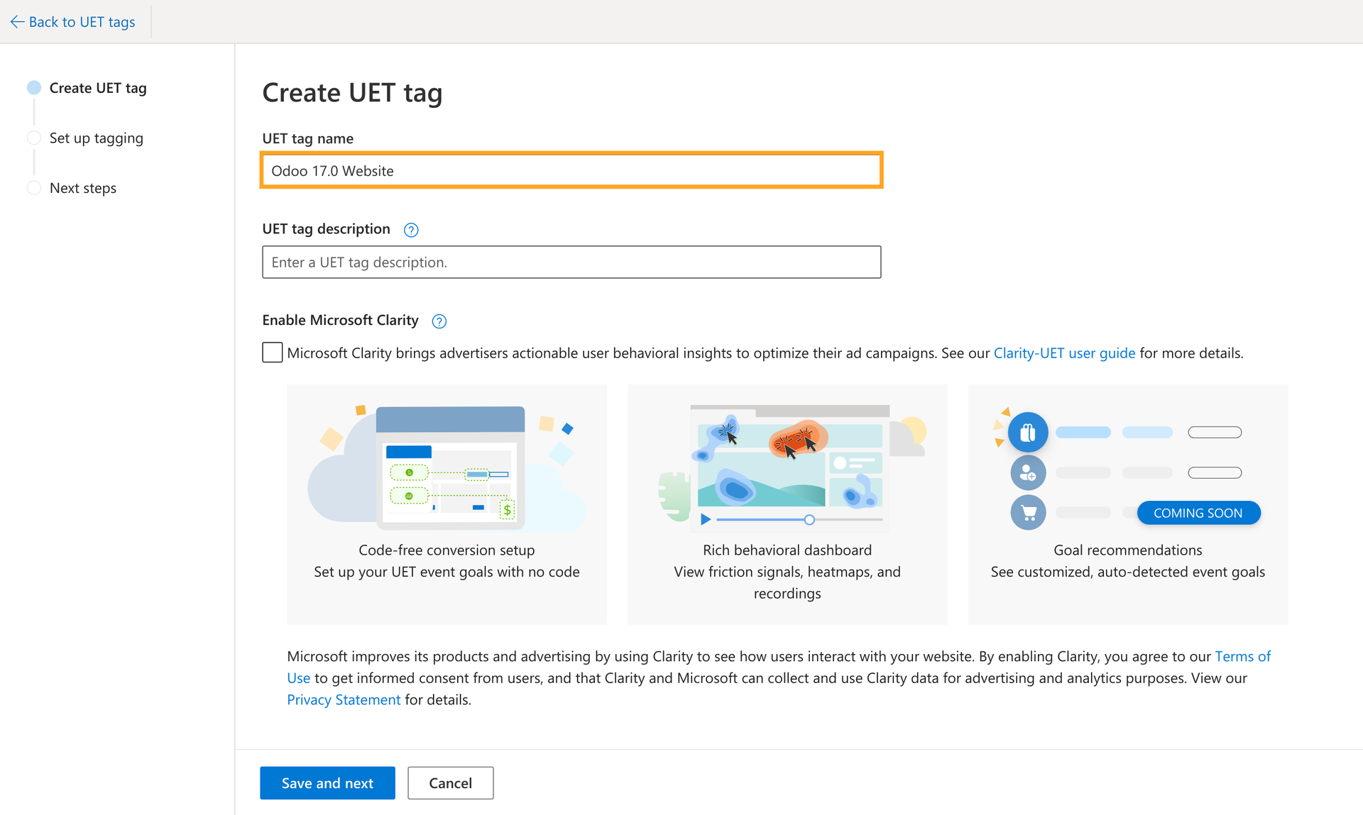Open your Microsoft Advertising account and in the Conversions section, choose the UET tag menu. Click on the Create and fill in your UET tag name in the next window. After completing, click on Save and next: