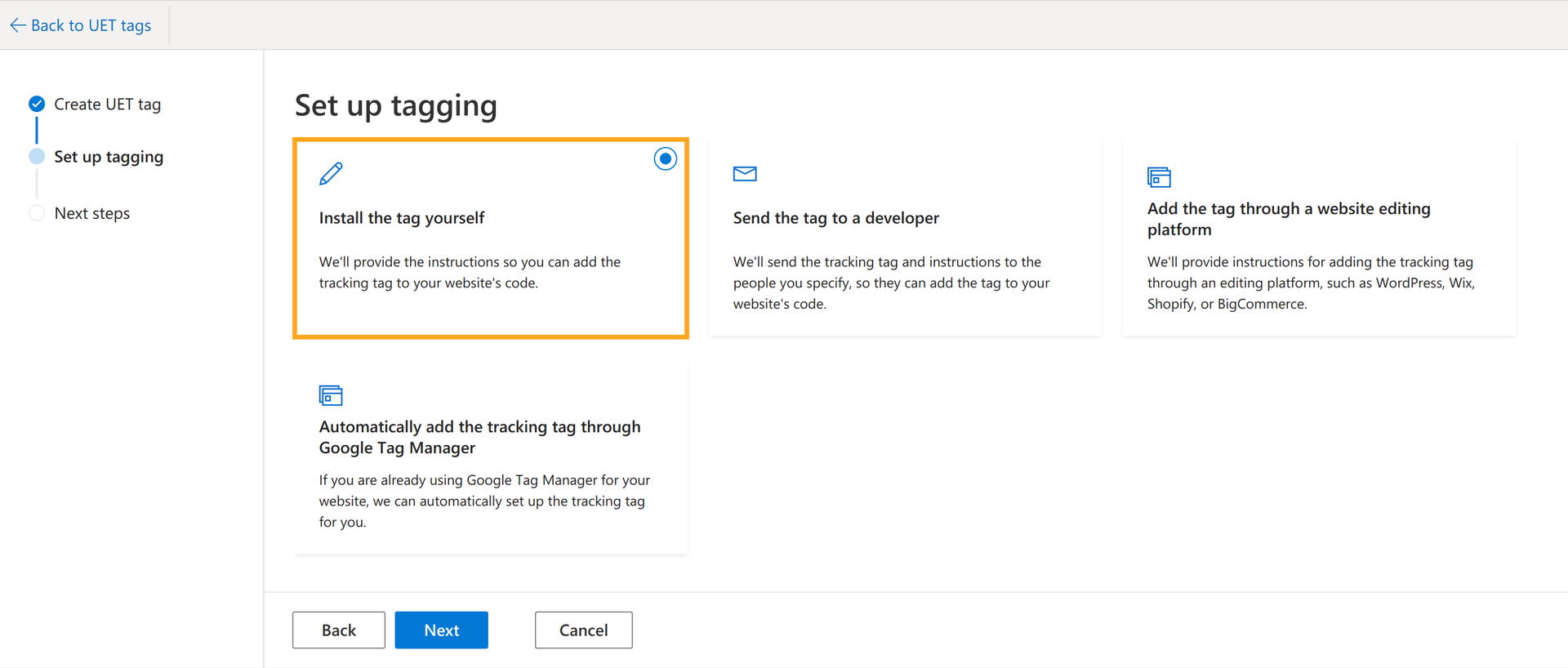 On the following step, select a tag installation option Install the tag yourself and continue by clicking the Next:
