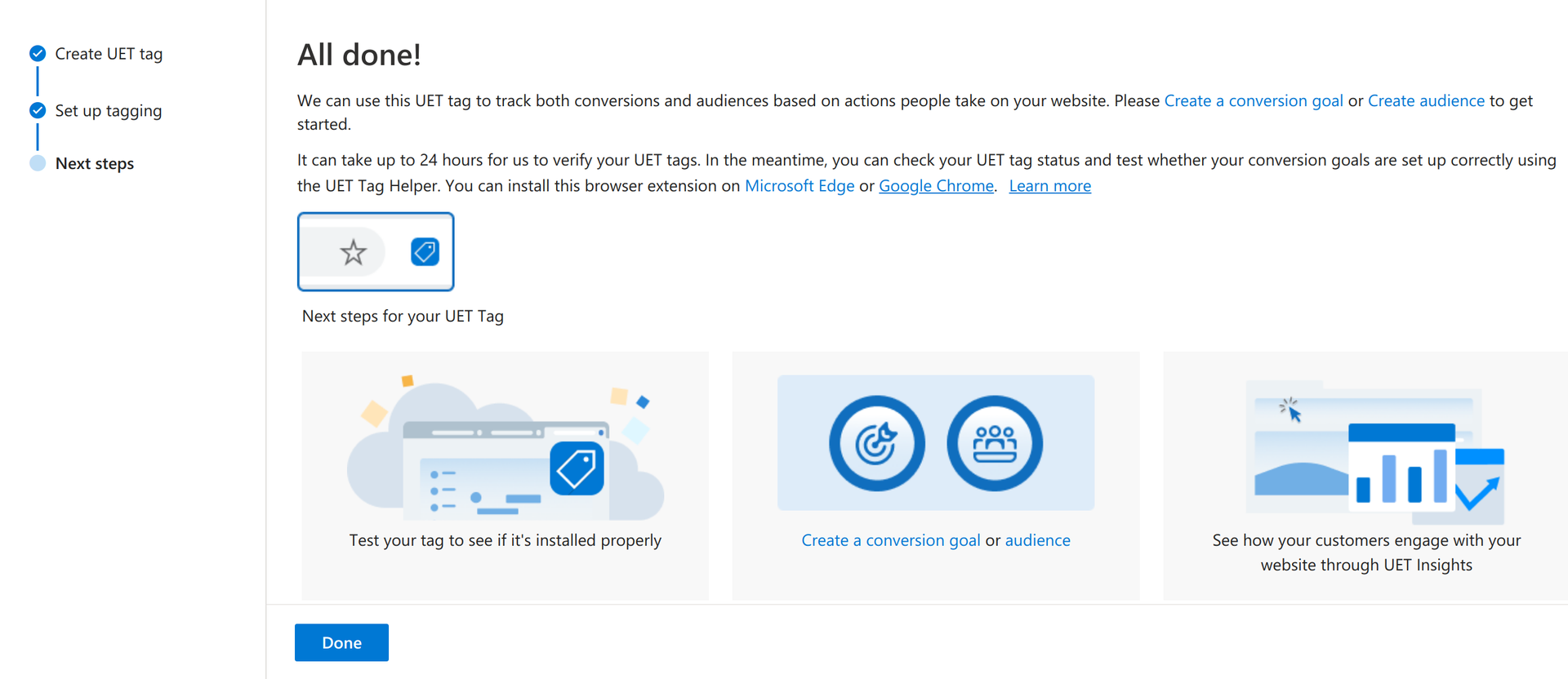 To ensure that the UET tag works properly, use the browser extension UET Tag Helper: